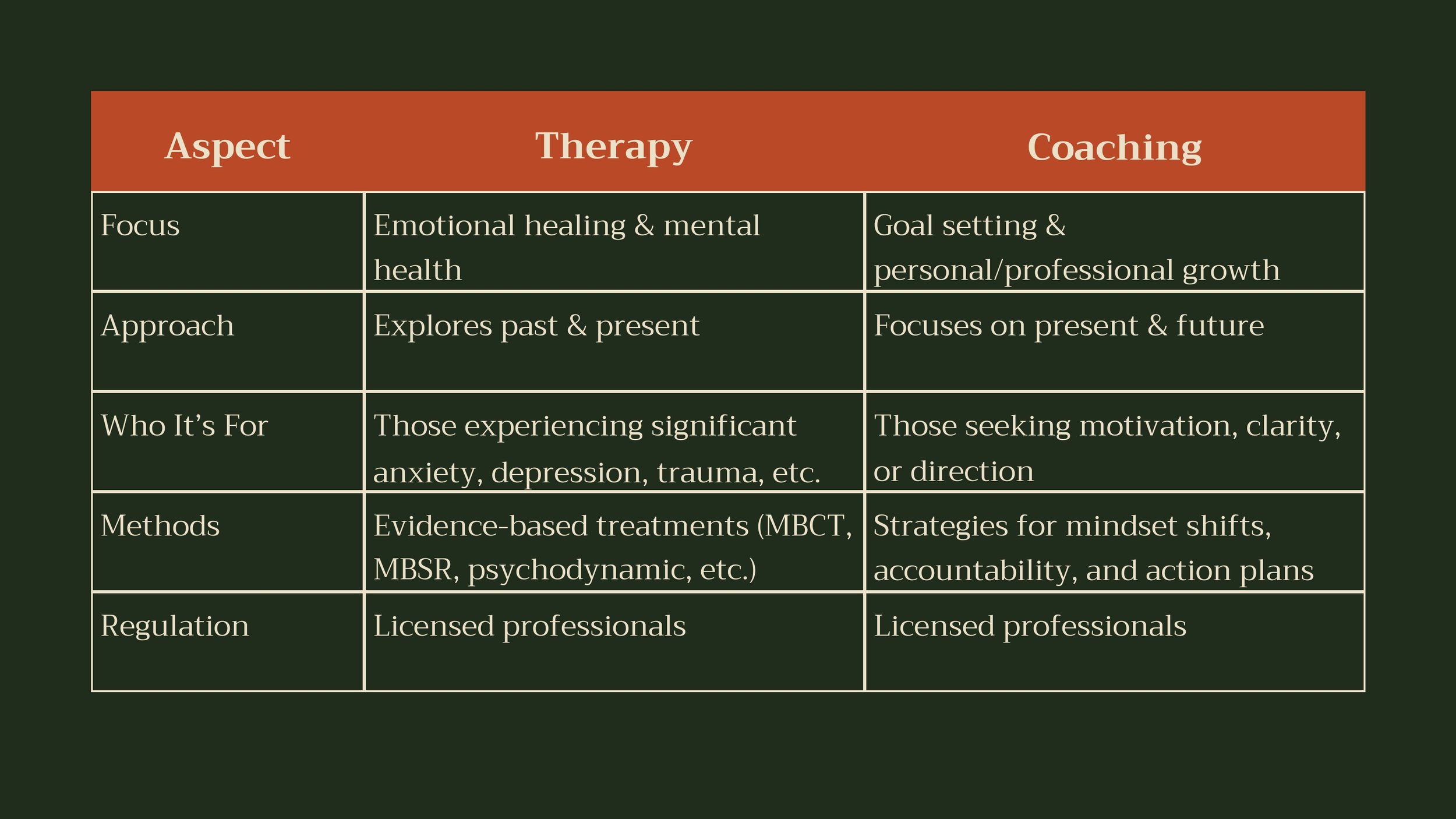Coaching is often seen as more socially acceptable than therapy due to the lingering stigma around mental health. Many may hesitate to seek therapy because it is associated with having a "problem" or mental illness, whereas coaching is widely recognized as a proactive step toward success and personal development. Seeking support in the form of clinical therapy does not make you weak, nor is coaching only for the “successful”. We believe it is just a matter of where you are in your personal journey at this given moment and we will meet you there.